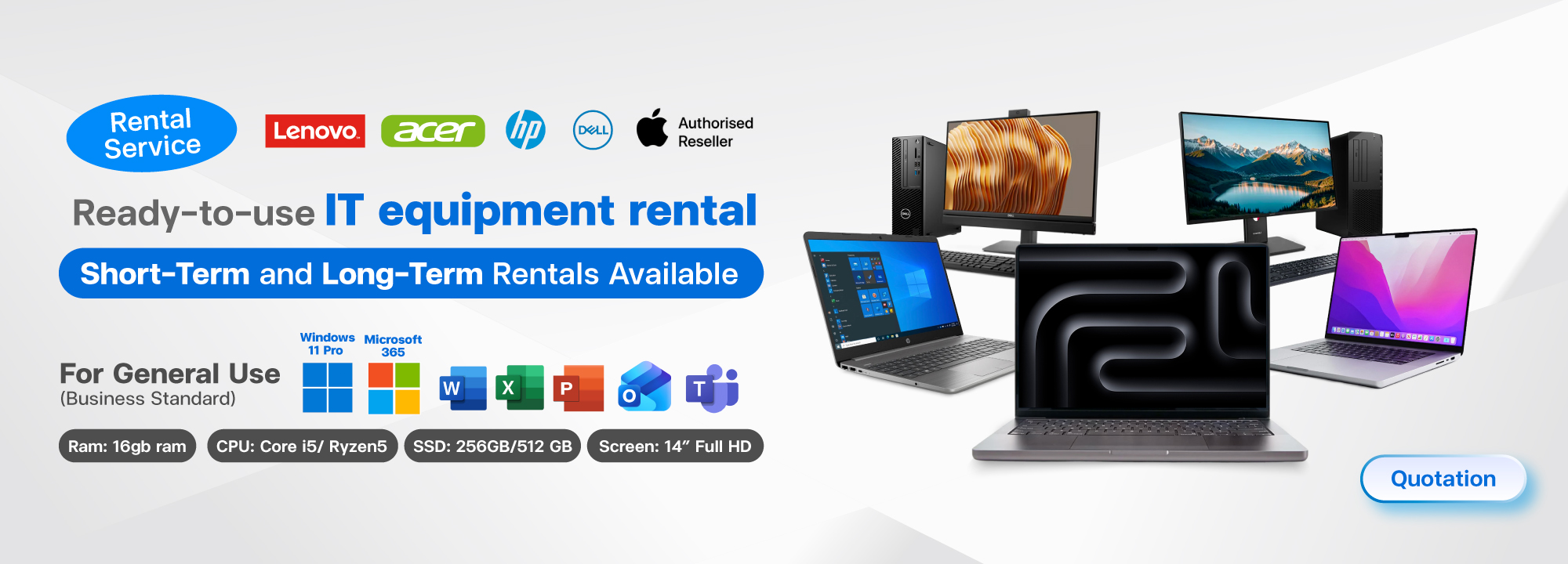 We provide a wide range of equipment, including laptops, desktops, workstations, monitors, servers, printers, networking devices, storage solutions, and UPS power backup systems.